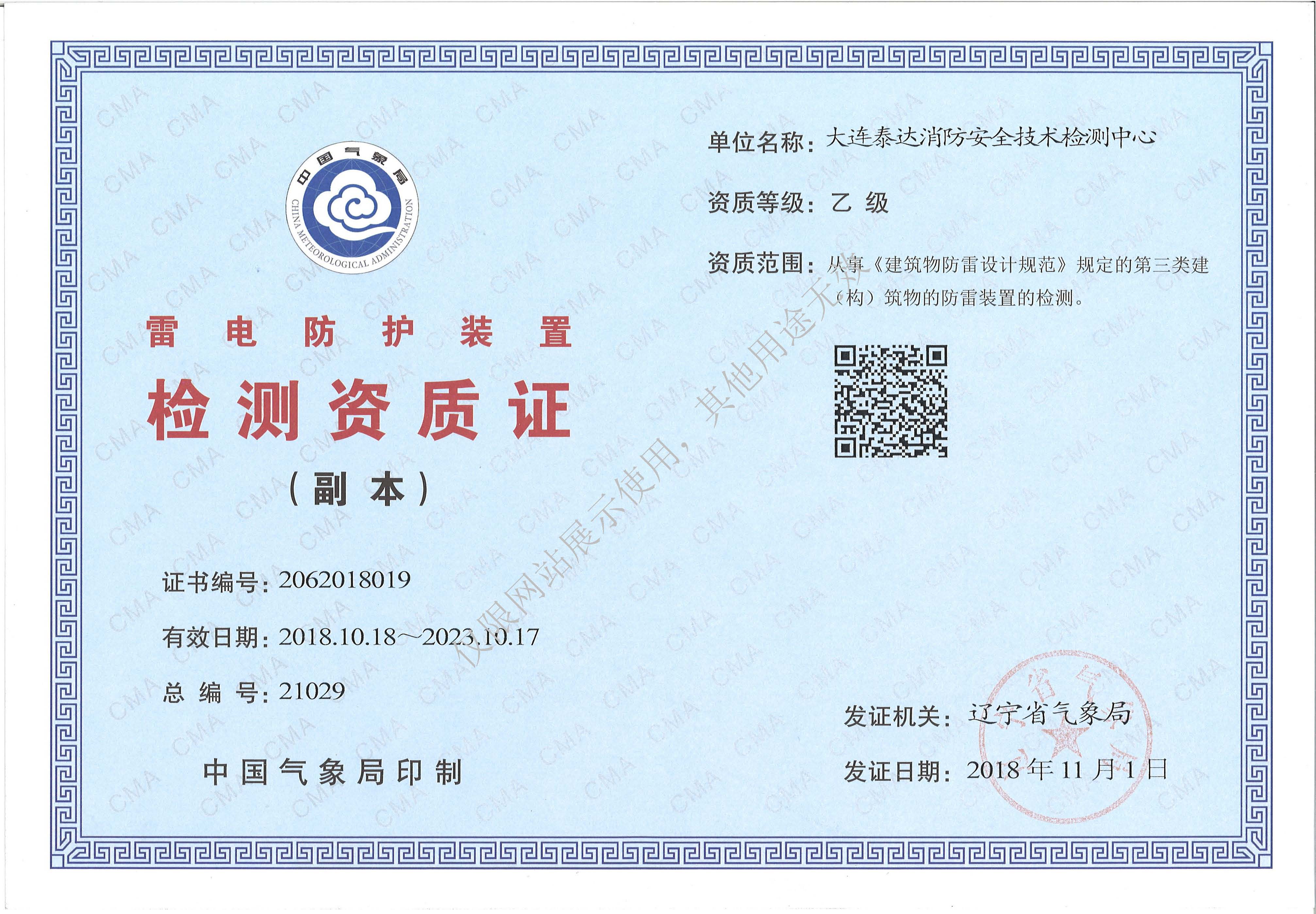 · 是經(jīng)“社會(huì)消防技術(shù)服務(wù)信息系統(tǒng)”備案并公示的消防技術(shù)服務(wù)機(jī)構(gòu),已取得中國(guó)氣象局頒發(fā)的雷電防護(hù)裝置檢測(cè)資質(zhì)證書(shū)、遼寧省質(zhì)量技術(shù)監(jiān)督局審核批準(zhǔn)的檢驗(yàn)檢測(cè)機(jī)構(gòu)資質(zhì)認(rèn)定證書(shū)(CMA)及包括消防檢測(cè)、電氣檢測(cè)、雷電防護(hù)裝置檢測(cè)、防火涂層厚度檢測(cè)等在內(nèi)的200余項(xiàng)檢驗(yàn)檢測(cè)能力,取得大連市應(yīng)急管理局頒發(fā)的安全生產(chǎn)標(biāo)準(zhǔn)化證書(shū),獲得質(zhì)量管理體系、環(huán)境管理體系、職業(yè)健康安全管理體系認(rèn)證證書(shū),是經(jīng)備案的高新技術(shù)企業(yè),可獨(dú)立出具具有證明作用的檢測(cè)報(bào)告。